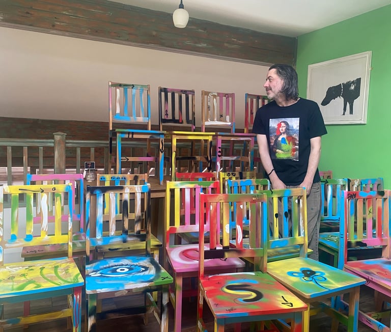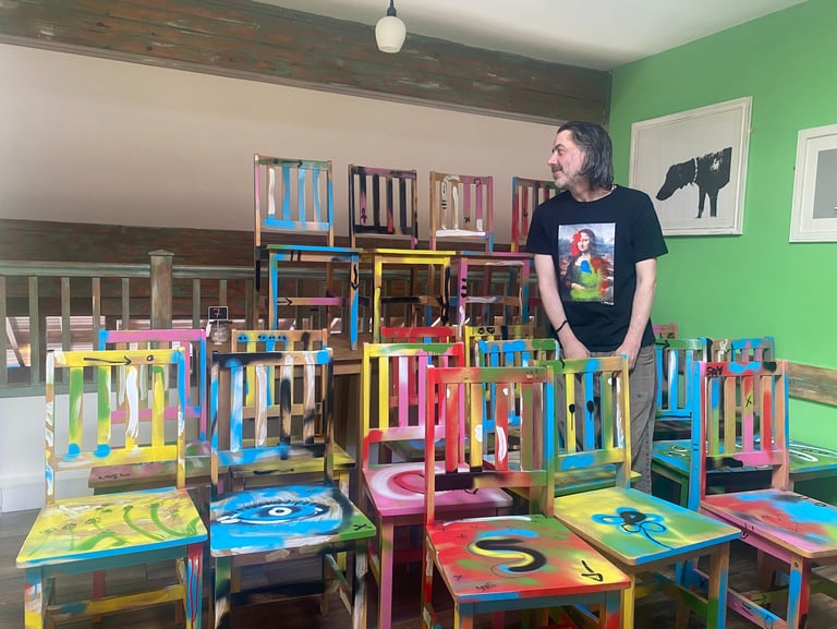 The café's tired-looking chairs and tables were given a new life with the artist's unique painting skills -